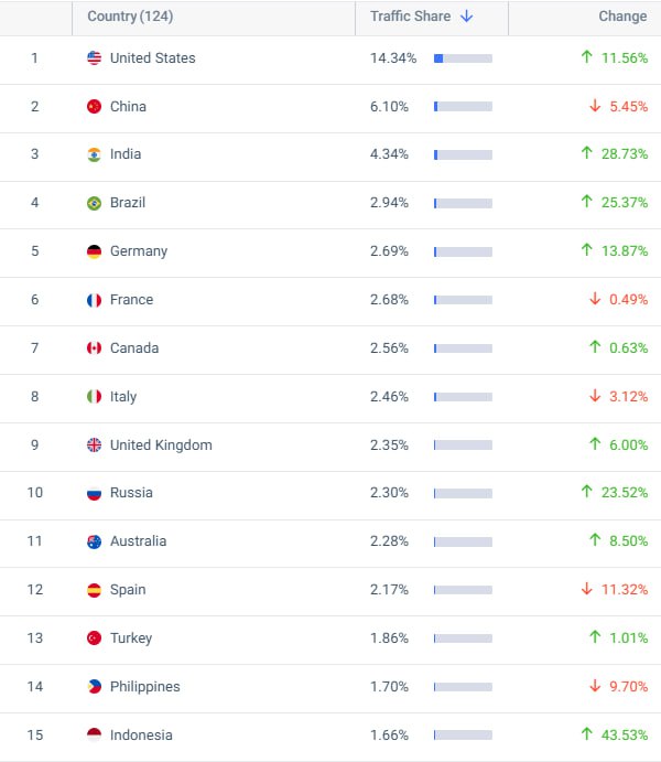 - США — абсолютні лідери з 14.34% трафіку