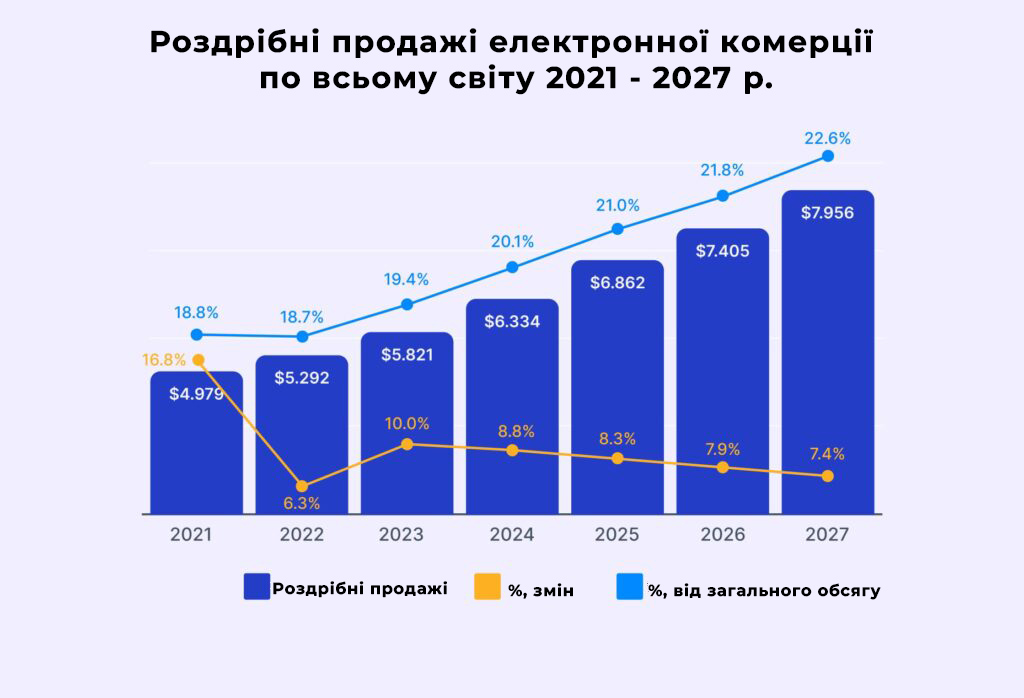 Понад 33% населення світу робить покупки онлайн, електронна комерція зараз є індустрією вартістю $6,8 трлн і досягне позначки $8 трлн до 2027 року.